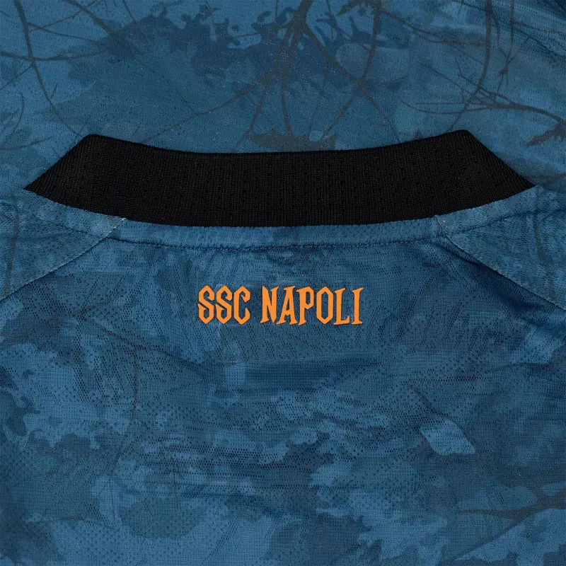 The SSC Napoli 2025/2026 Halloween match jersey stands out for its bold and original design, featuring a graphic inspired by the spectral underwood, an iconic element tied to the Celtic origins of the Halloween tradition. The deep, dark base color evokes the darkness of the night, while vivid orange accents add striking contrast and visual energy.